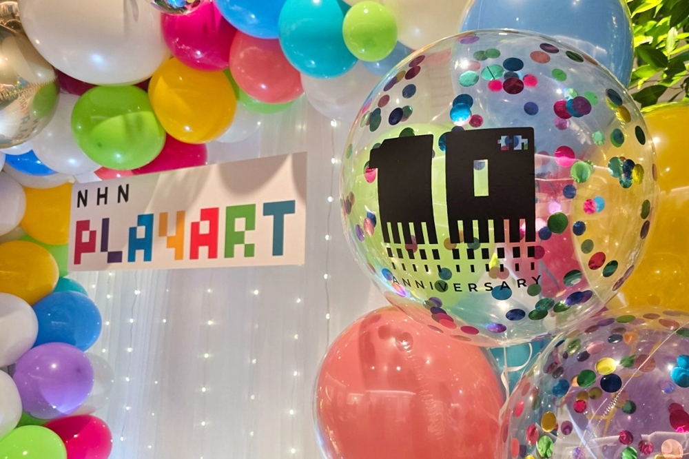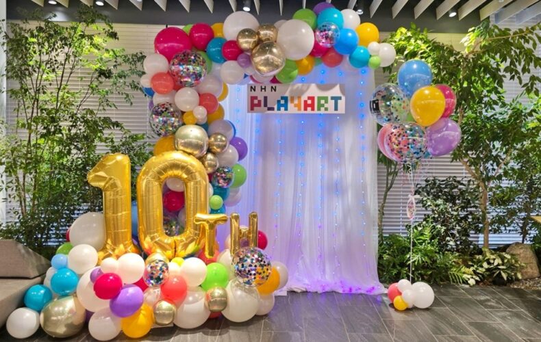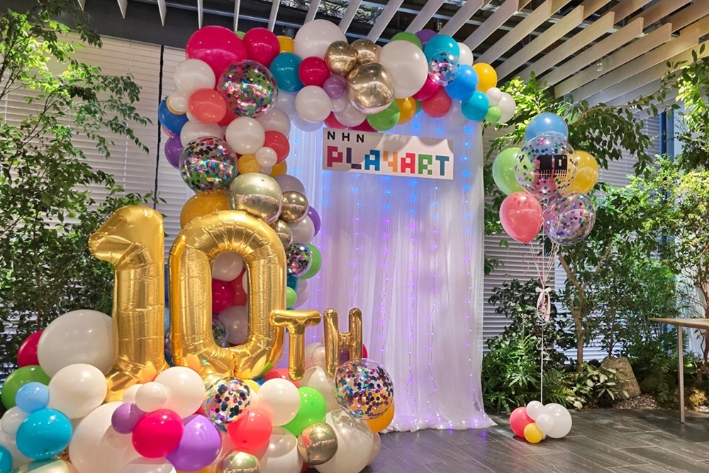 オリジナル制作の背景カーテンにはフルカラーLEDカーテンライトで華やかに演出。10周年ロゴ入りバルーンがアクセントになります。